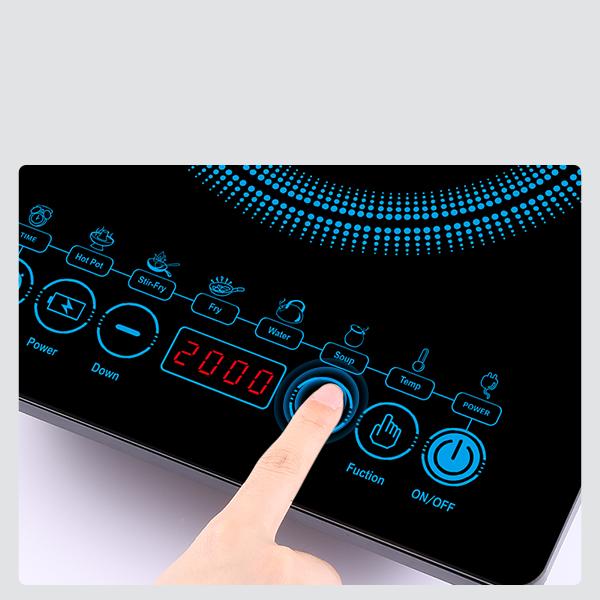 - Bảng điều khiển cảm ứng hiển thị màn hình LED, dễ hiểu. Có 5 chức nấu nướng theo thứ tự từ trái qua phải: Lẩu, xào, chiên, nấu nước, nấu suop.